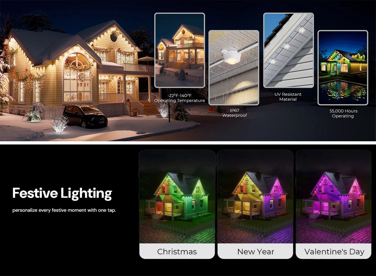 Built to Endure the Elements:With IP67 waterproof lights, UV-resistant housing, and an IP65-rated adapter, these lights are built to withstand rain, snow, and blazing sun. Plus, a working lifespan of up to 55,000 hours ensures your lighting display shines bright year after year.